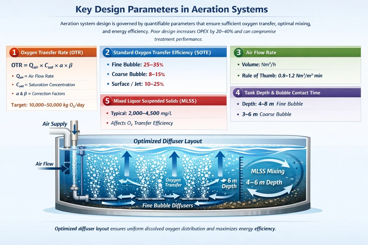 Parametry projektowe: Głębokość zbiornika, MLSS, przepływ powietrza, OTR, SOTE, współczynnik alfa i sterowanie dmuchawą są współzależne w celu optymalizacji wydajności.
