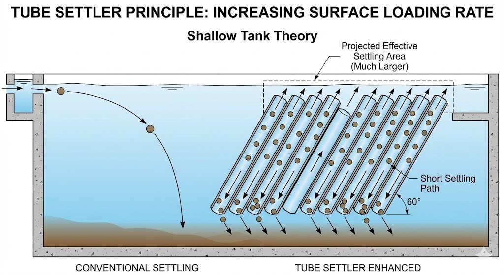 Osadnicy rurowi zastosować szereg nachylonych sześciokątnych kanałów, aby poprawić skuteczność osadzania ciał stałych w osadniku. Zwiększając efektywną powierzchnię zasiedlenia (wg Prawo Hazensa lub teoria płytkiego zbiornika ), moduły te pozwalają cząsteczkom spaść na bardzo małą odległość, zanim uderzą w ściankę rury i opadną na dno.