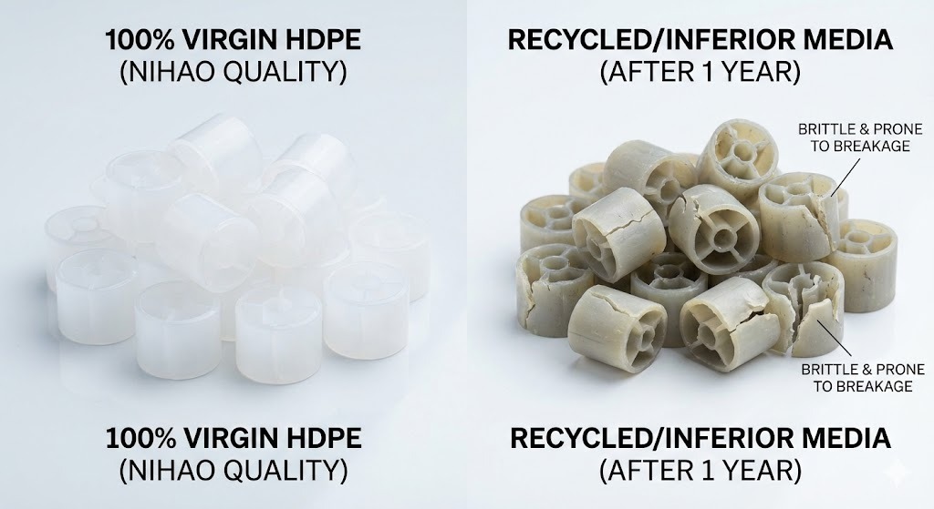 100% Virgin HDPE Preferowany jest (polietylen o dużej gęstości), ponieważ zapewnia doskonałą wytrzymałość mechaniczną, odporność chemiczną i prawidłową gęstość (0,95-0,97 g/cm3) do fluidyzacji. Materiały poddane recyklingowi często zawierają zanieczyszczenia, które powodują, że media stają się kruche lub powodują ich zatapianie, co prowadzi do awarii systemu w ciągu 2-3 lat.