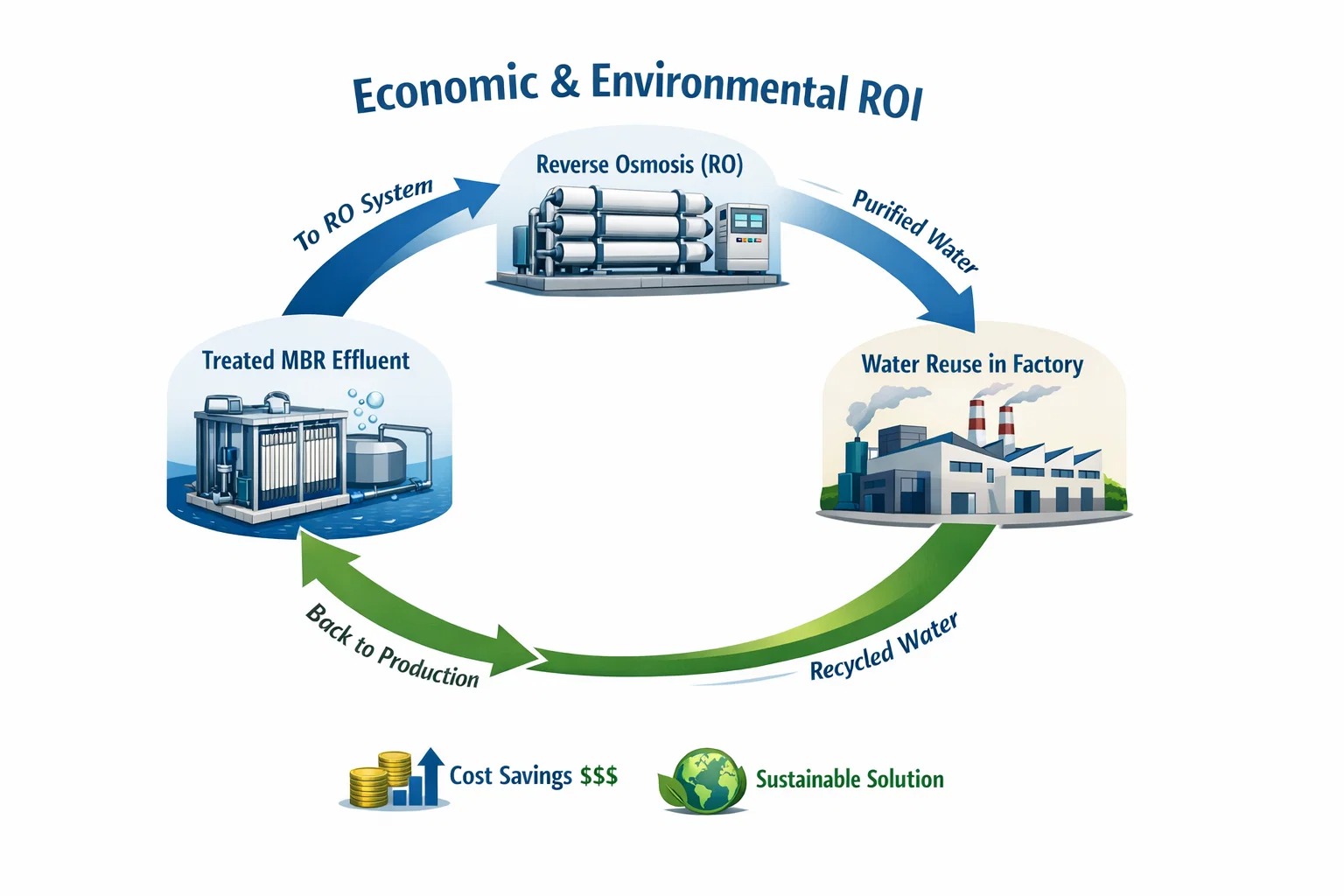W przemyśle farmaceutycznym i tekstylnym woda stanowi ogromny koszt ogólny. Ścieki MBR są tak czyste, że mogą służyć jako bezpośrednie źródło zasilania Odwrócona osmoza (RO) .