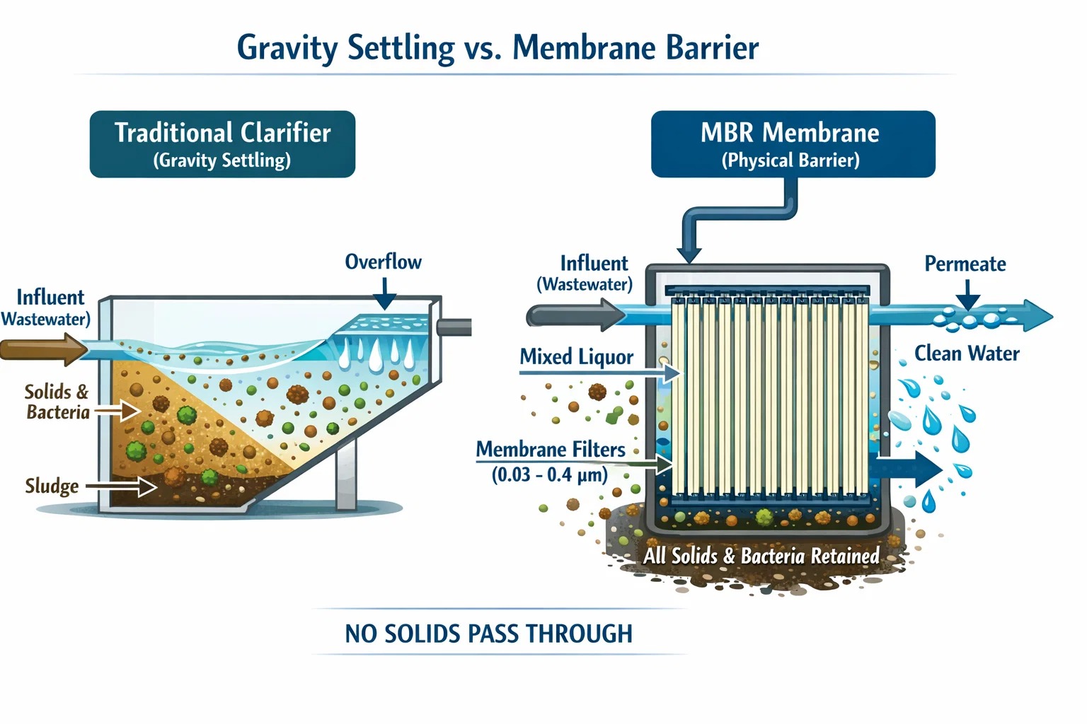 W konwencjonalnej instalacji jesteś ograniczony szybkością opadania cząstki. W MBR używamy a fizyczna bariera membranowa (zwykle od 0,03 do 0,4 µm).
